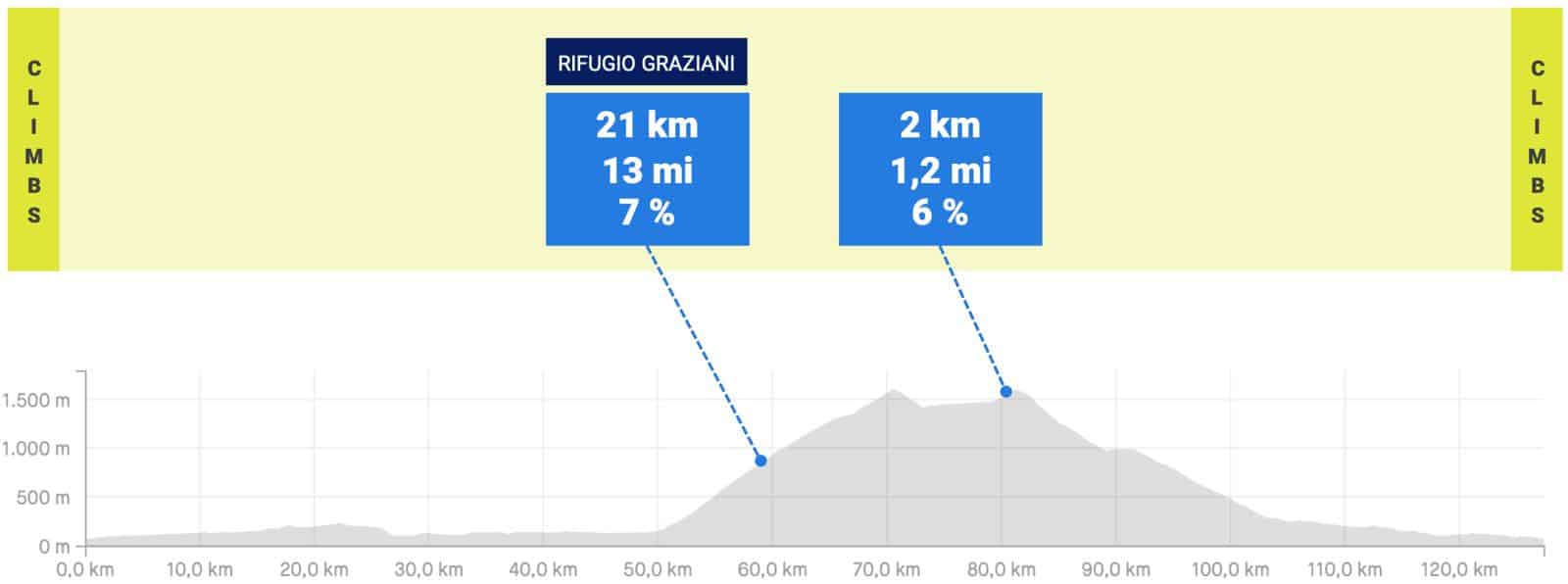 Monte Grappa é famoso por sua importância histórica como palco de batalhas entre italianos e austríacos na Primeira Guerra Mundial. No topo está o imponente Santuário de Monte Grappa, monumento aos milhares de soldados que perderam suas vidas. A rota começa em Marostica, cidade medieval com a famosa Piazza degli Scacchi, lar de um tabuleiro de xadrez humano. Após Bassano del Grappa, inicia-se a subida árdua de Monte Grappa: 19,1 km com inclinação média de 8,1%. No topo, vistas deslumbrantes; em dias claros, é possível ver o reflexo da Lagoa de Veneza. No Giro d’Italia 2024, Pogacar confirmou sua vitória nesta subida, que foi enfrentada duas vezes.